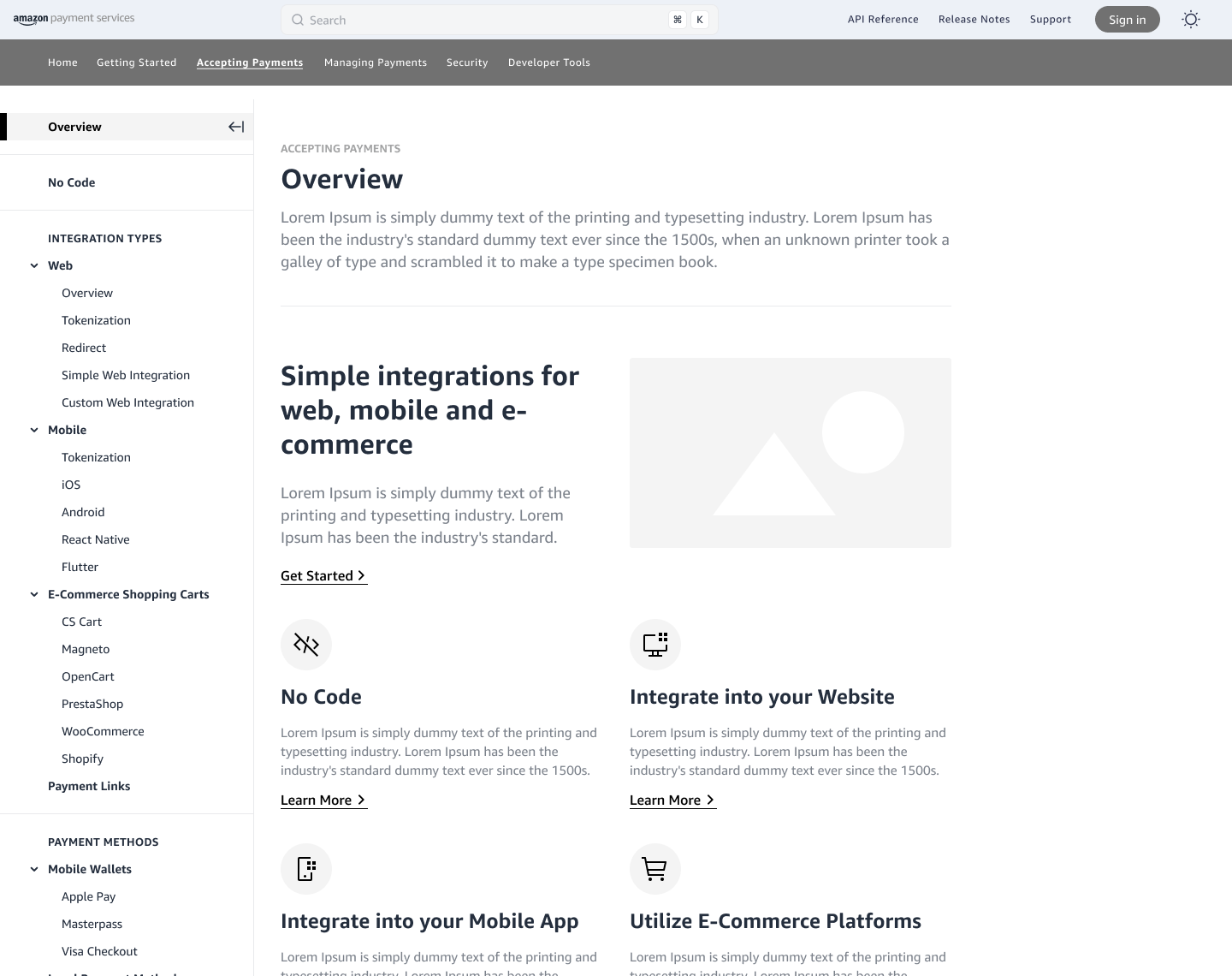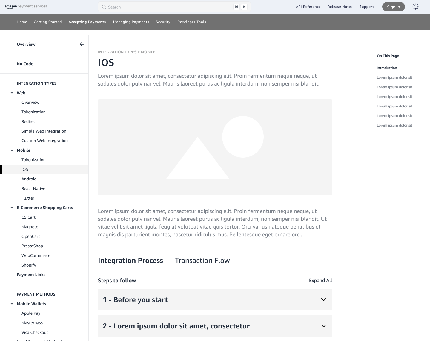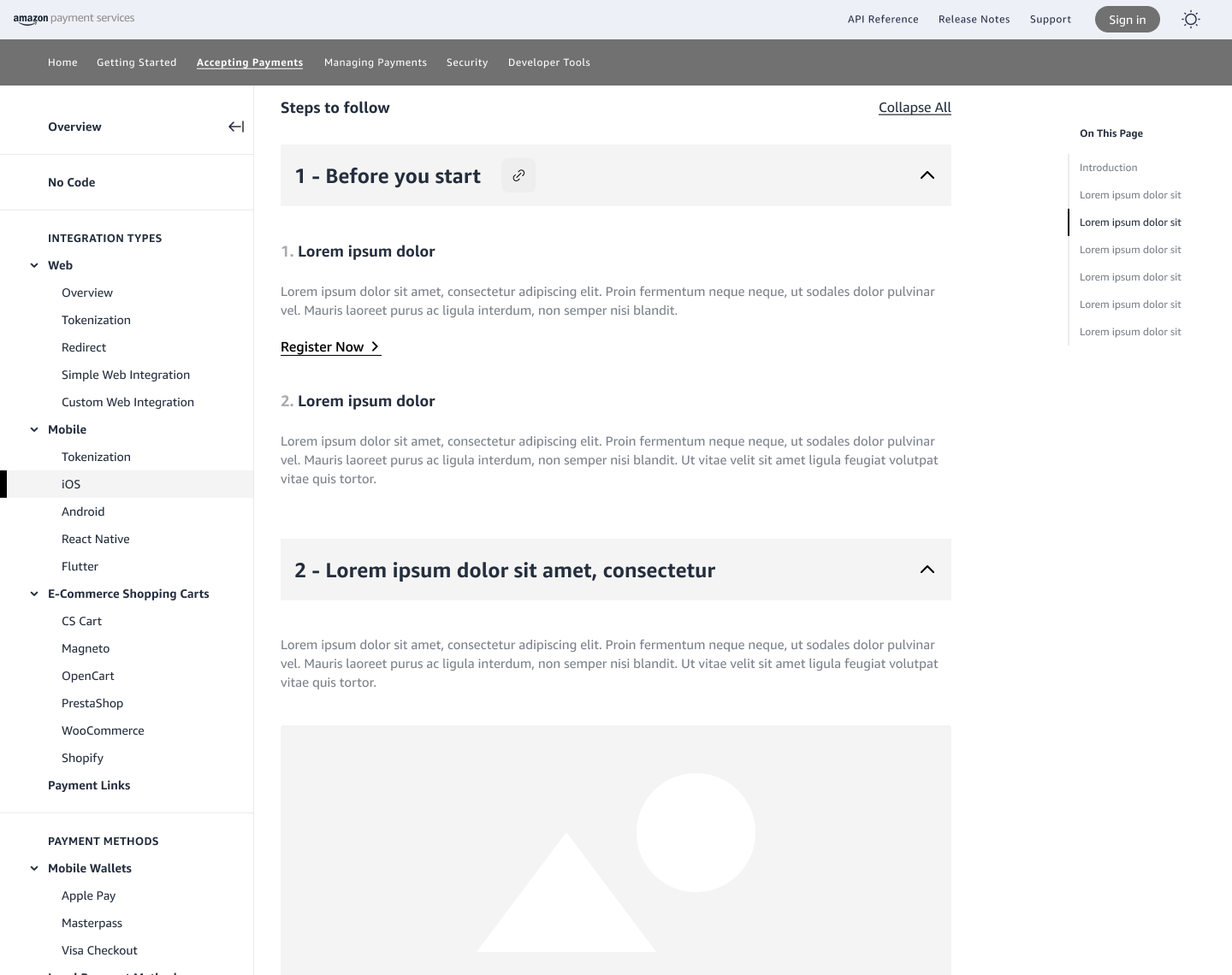 I redesigned documentation page templates to improve hierarchy, navigation, and content clarity at page level. Wireframes were used to explore alternative layout options, clarify content groupings, and define clearer separation between conceptual guidance and implementation steps.